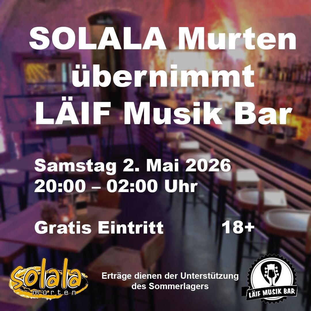 Am 02 Mai 2026 schlüpft das Solala in eine neue Rolle und übernimmt für einen Abend die LÄIF Musik Bar. Ob hinter der Theke, an der Tür oder beim servieren - das Team sorgt nicht nur für beste Stimmung sondern auch volle Gläser. Die Einnahmen des Abends dienen der Unterstützung des Sommerlagers. Kommt vorbei, geniesst einen tollen Abend und unterstützt dabei das SOLALA.