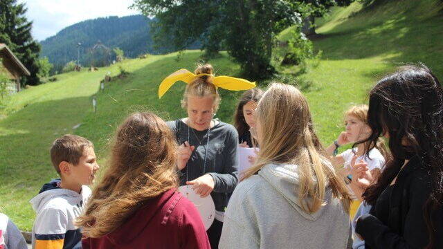 Heute sind wir um 8:15 Uhr aufgestanden und um 8:30 Uhr gab es Frühstück. Während dem Frühstück haben wir erfahren, dass das Thema des Tages «Alice im Wunderland» ist. Danach hatten wir Freizeit. Fürs Morgenprogramm mussten wir etwas machen, um Alice zu helfen – zum Beispiel ein Fahrzeug oder eine Karte, um sich zurecht zu finden. Als wir damit fertig waren, haben wir unsere Sachen vorgestellt.
